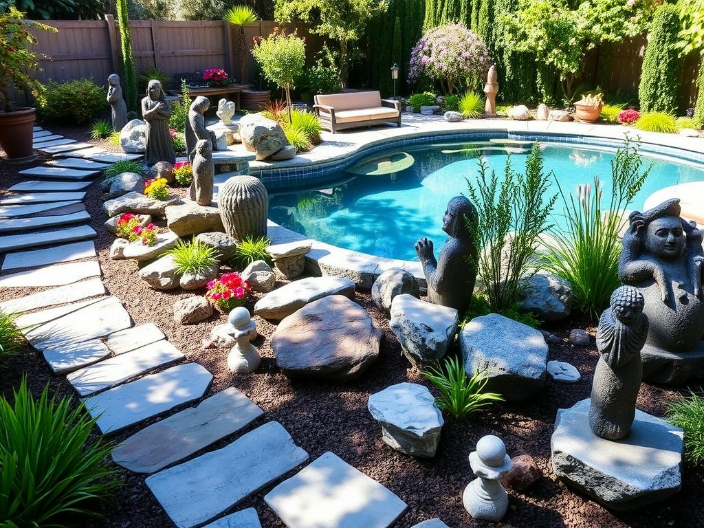 Decorative stone arrangements in gardens or around pools.